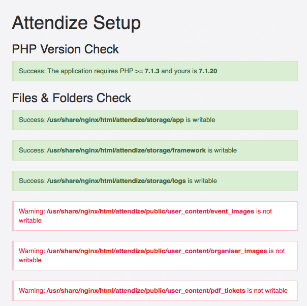 If you do get the installer screen like below but there are errors please correct them before trying to proceed and install Attendize. Once you have corrected the errors simple refresh the page so the installer can run the checks again.