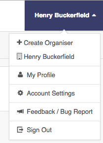 - To configure the payment gateway details for your installation once logged in click on the Organiser name in the top right and select Account Settings.