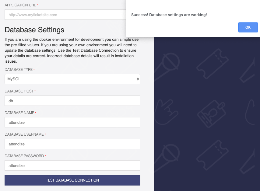 If you are installing Attendize elsewhere you might need to use localhost or the hostname of your database server. You can test if your database connection details work from the installer UI using the test database connection button once you have entered your database connection details.